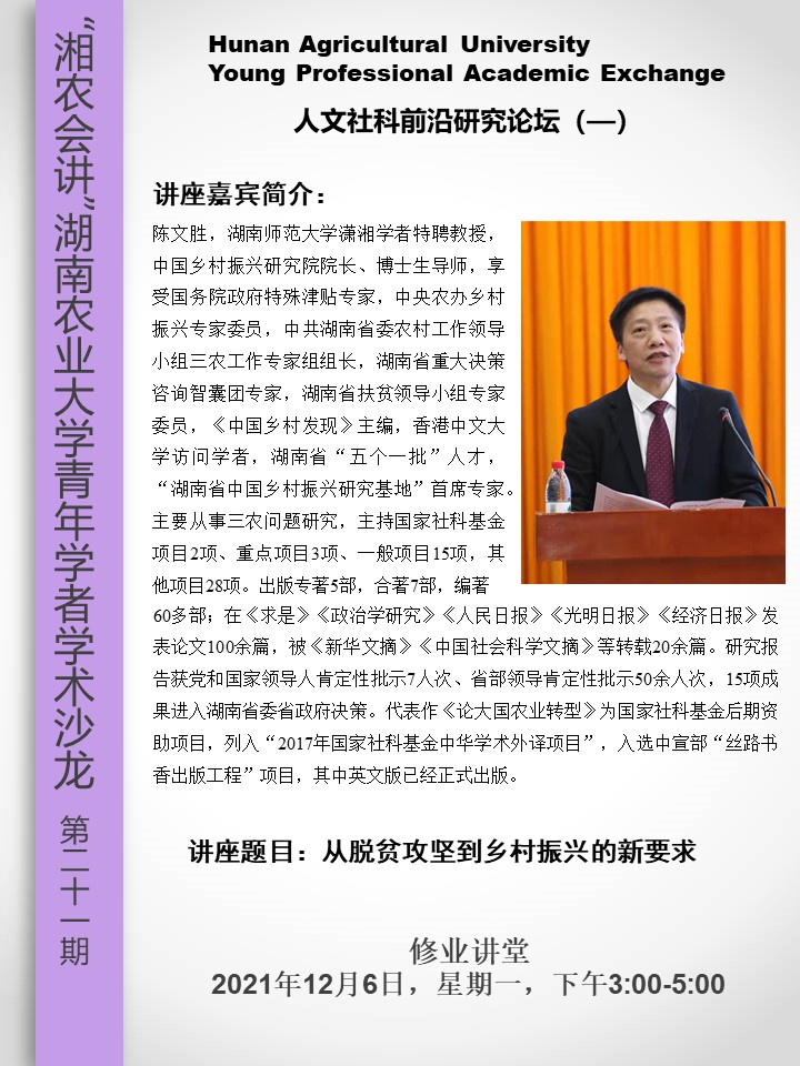 “湘农会讲”湖南农业大学青年学者学术沙龙第二十一期报告