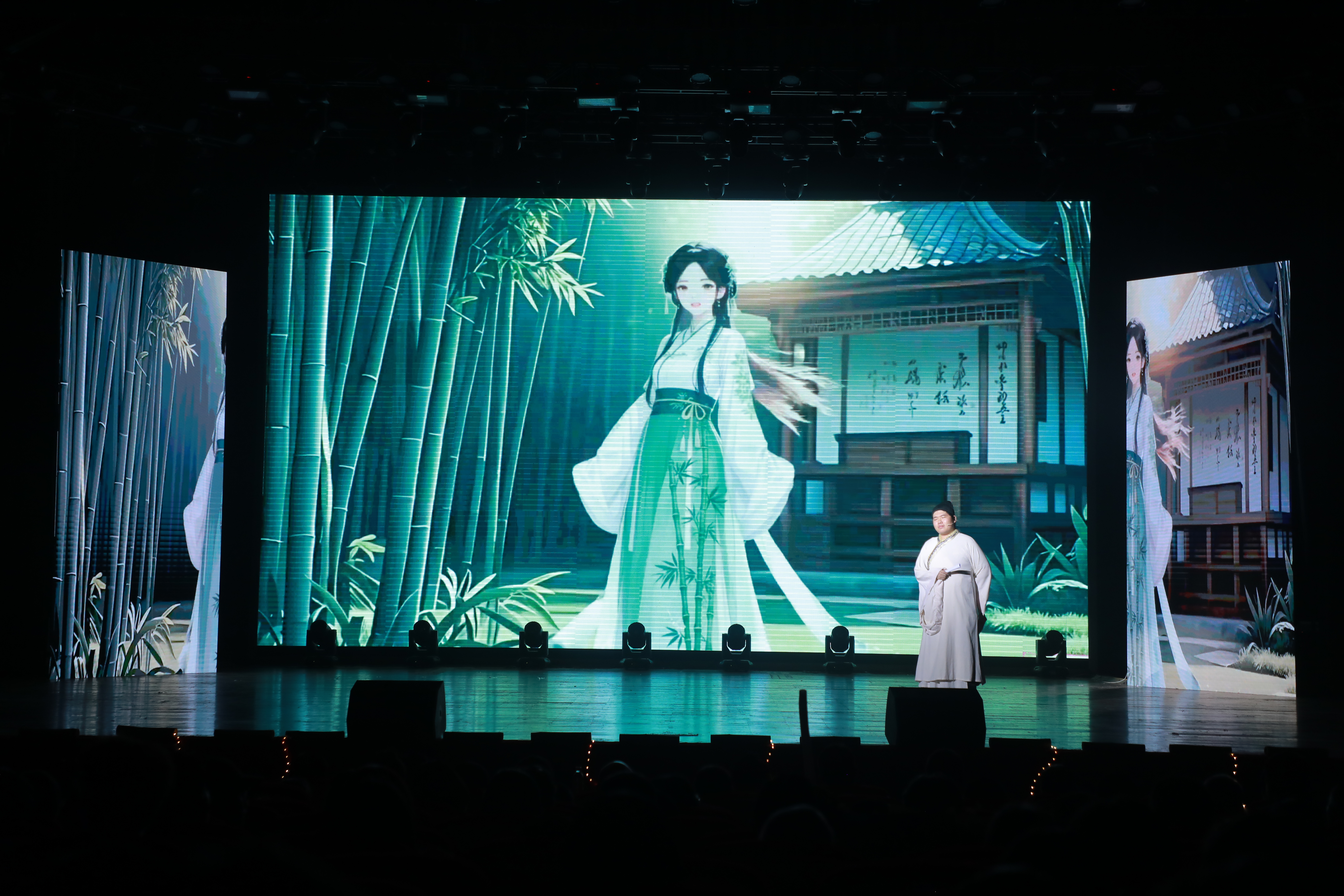晚会以“竹迹•逐光”为主题,分为破土、拔节、傲立、常青四个篇章,首次引进AI技术,精心打造虚拟人物学生小竹,通过和“穿越时空”的古代教书先生对话来给予观众沉浸式的体验感。晚会以竹的生长过程为主线,展现出毕业生大学生涯不同阶段的成长历程,诉说对母校的感激之情。